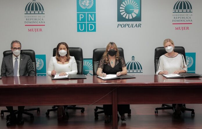 En la firma del convenio, suscrito en la Torre Popular, participaron Mayra Jiménez, ministra de la Mujer, e Inka Mattila, representante residente del PNUD para la República Dominicana, además de la señora Antonia Antón de Hernández, en nombre del Popular.